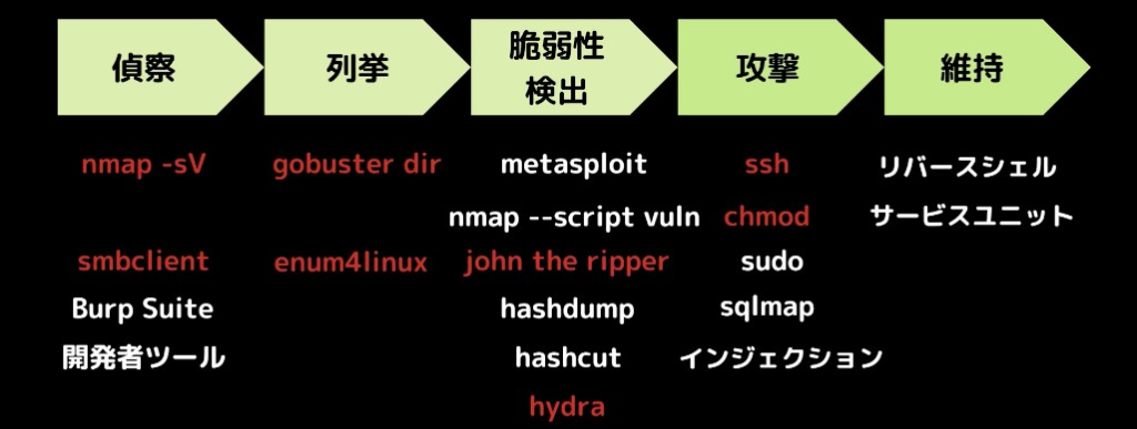 ハッキングは闇雲に攻撃するのではなく、以下のようなステップを踏んで進められます。